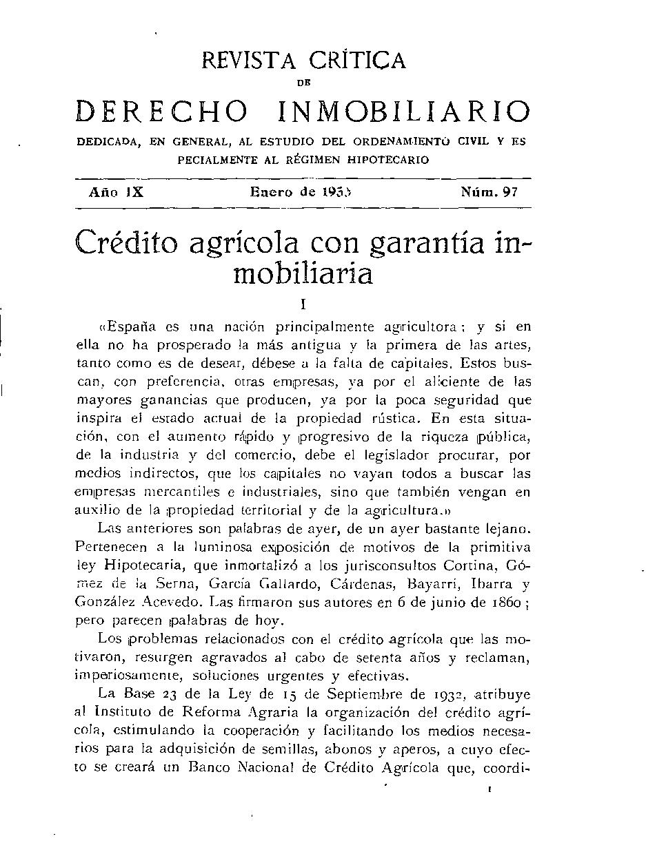 Crédito agrícola con garantía inmobiliaria. (1933). Revista Crítica De Derecho Inmobiliario, 97, 1 a 18. https://www.revistacritica.es/index.php/rcdi/article/view/9710